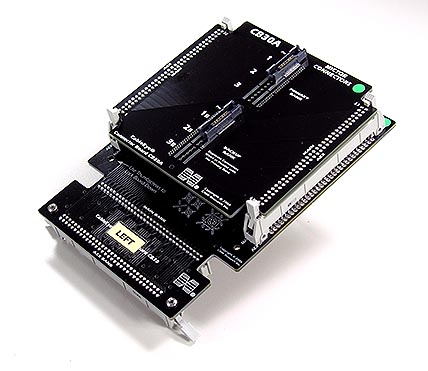 This generic board, similar in design to the CB8, accepts a wide range of circular connectors, rectangular connectors, bracket-mounted assemblies, and adapter cables. The customer mounts the connectors of interest using supplied standoffs and screws (see Photo 6 below). Any panel-mount circular connector with four mounting holes fits the "X" pattern slots on this board. Mount up to four small circular connectors (mounting hole spacing less than 0.9"), or one large connector (mounting hole spacing less than 2.3"). Holes may be drilled in the board to accommodate other mounting arrangements. Wire pins from the attached connector to labeled pads surrounding the board. Use the numerous small holes around the board for nylon lacing to hold wiring in place. Alternatively, mount dual-row headers of up to 64-pins to the right and left pad footprints, spaced on a 0.1" grid (see Photo 3 below). Use these headers for a custom-designed daughter board that plugs into the CB30 (see Photos 4 and 5 below) or for flat cables. Instead of a single 64-pin header, attache combinations of smaller headers that have a 0.1x0.1" footprint. A total of up to 128 pins can be accommodated per board.