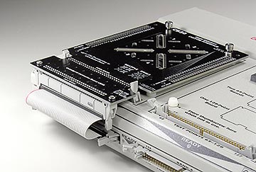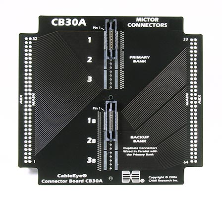 When the wiring is displayed, a generic dual-row header is shown for the connector. Use the optional PinMap software (recommended for this board) to choose a different graphic from the CableEye connector library and assign custom pin labels. Use two CB30 boards together, or a CB30 in combination with any other CB board to accept any connector combination. Review the photos below for the setup options, or click to see photos of custom CB30 applications. Set of two boards with expander cables. Requires 256 test points.