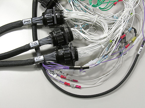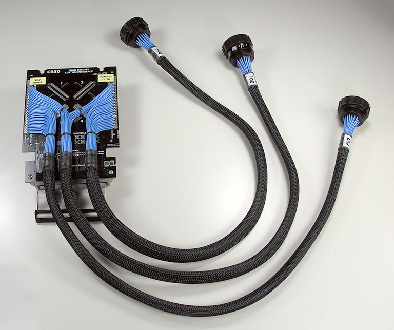Three large adapter cables are wired to a CB30 board as part of a complex wire harness interface.